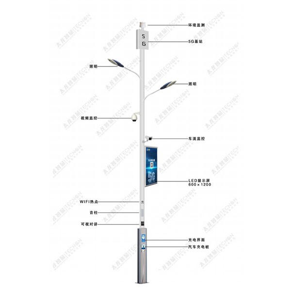 所謂智慧城市建設設備5G綜合桿就是傳統(tǒng)燈桿上集成多種功能設備,讓燈桿實現(xiàn)“一桿多用”,不在局限于單一的照明。比如說圖中展示:汽車充電樁、可視對講、WiFi熱點、信息發(fā)布屏(LED燈桿屏)、車流監(jiān)控、視頻監(jiān)控、主輔智能照明、5G基站以及各項環(huán)境檢測等,然后利用物聯(lián)網(wǎng)及互聯(lián)網(wǎng)技術實現(xiàn)智能化管理。讓普通燈桿升級為智慧城市信息采集的5G綜合桿、便民服務終端。